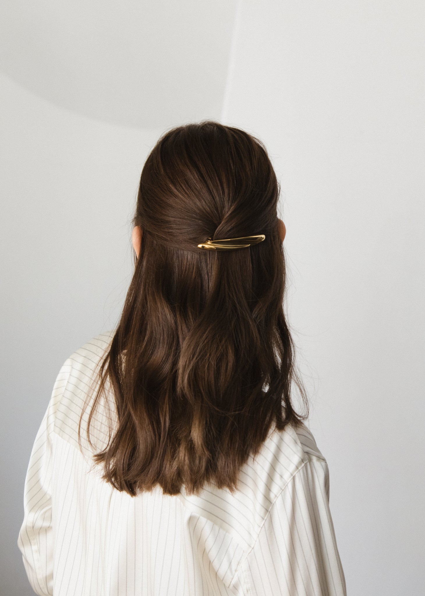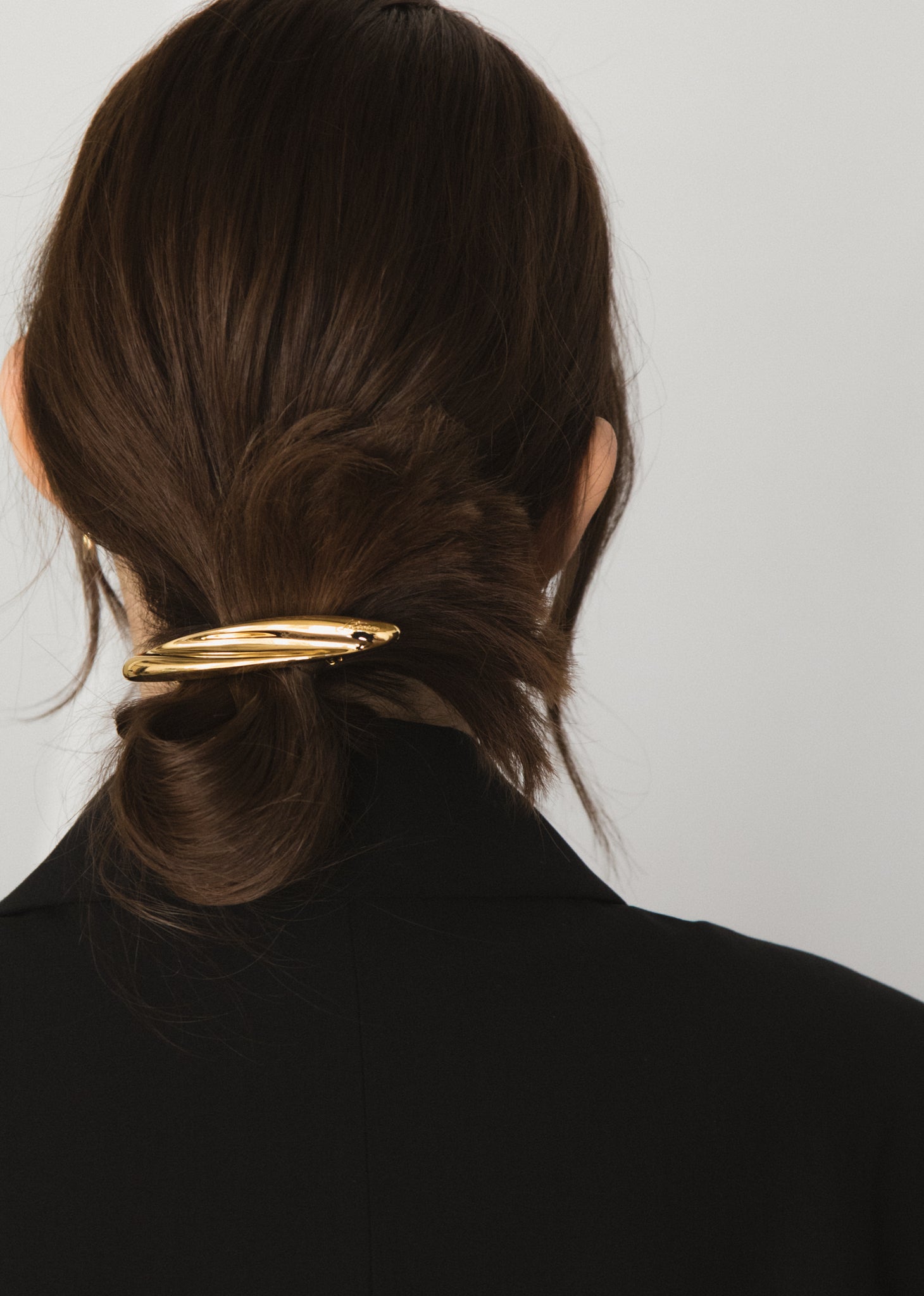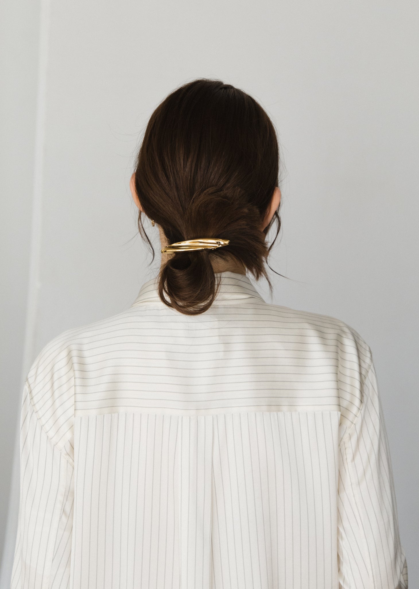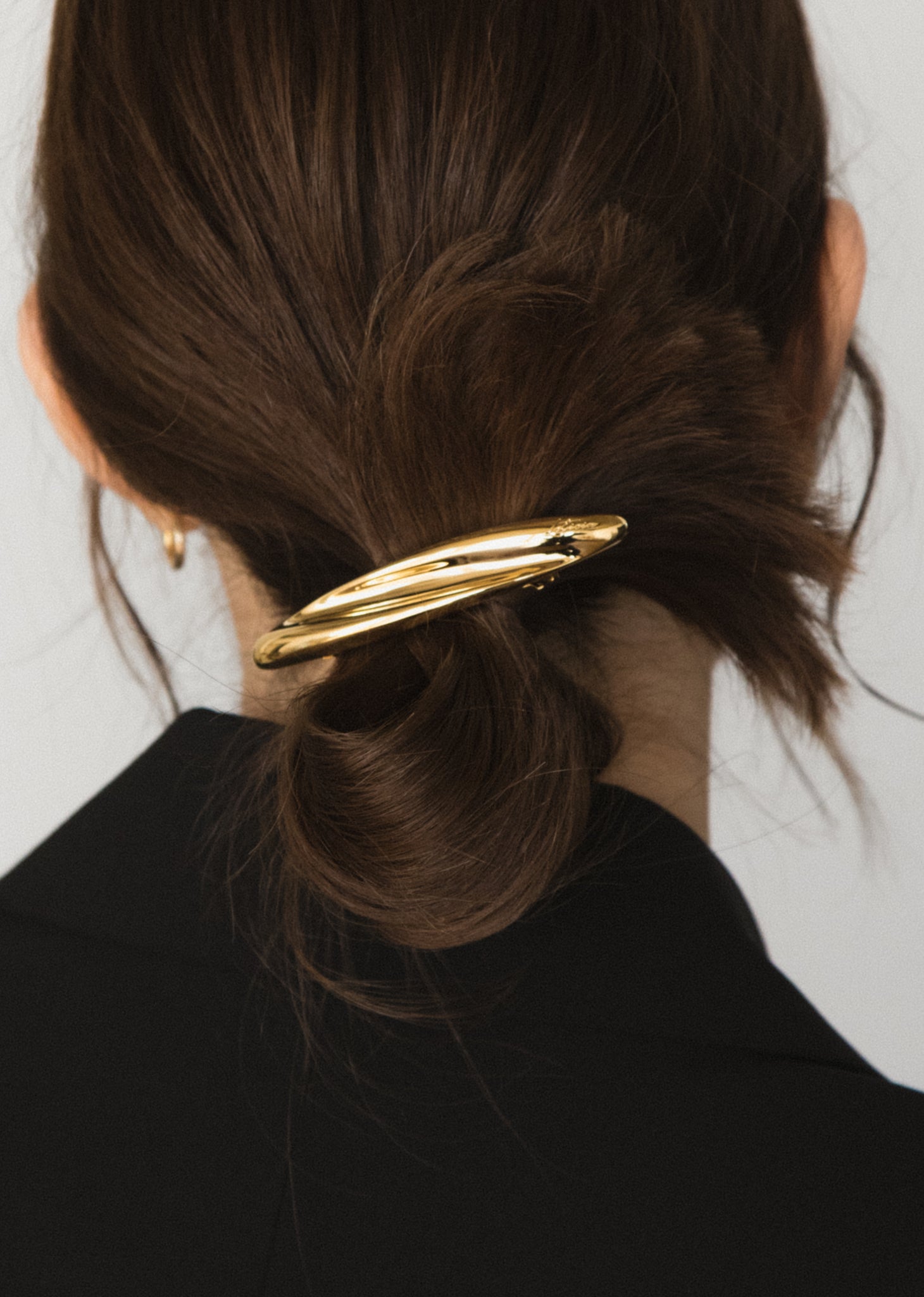 流れるような曲線と、艶やかなゴールドの輝き。身につけた瞬間、後ろ姿まで凛と整い、コーディネートが完成する。まるでジュエリーのように、装い全体をさりげなく引き上げます。